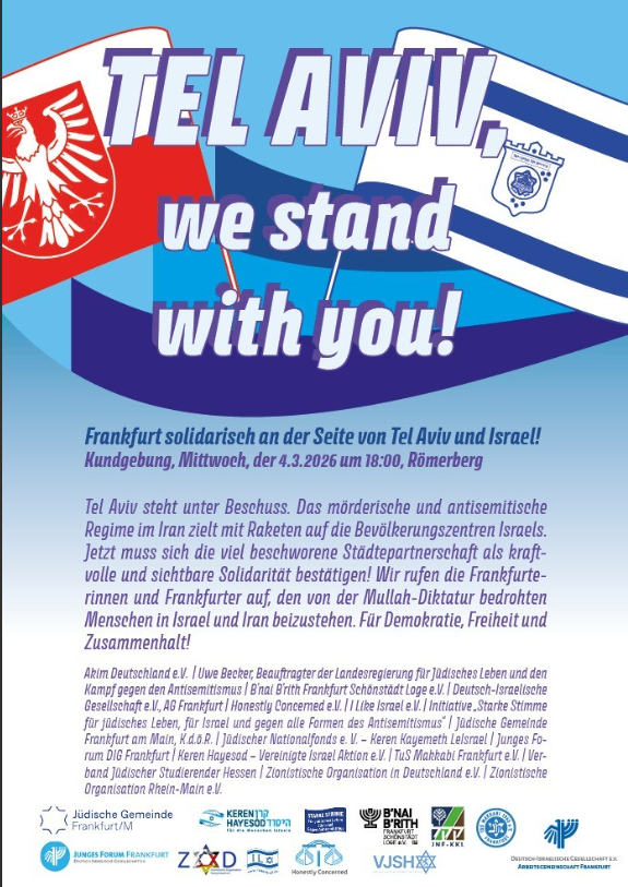 Tel Aviv steht unter Beschuss. Angesichts der dramatischen Situation in unserer Partnerstadt haben wir kurzfristig eine Kundgebung für Mittwoch 04.03.2026, um 18:00 auf dem Römerberg angemeldet. Bitte kommen Sie zahlreich und unterstützen Sie die von der Mullah-Diktatur bedrohten Menschen in Israel und Iran.