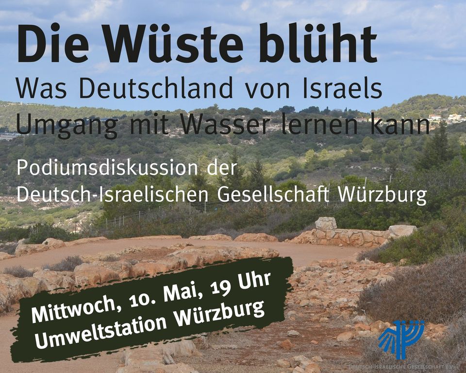Am Mittwoch, 10. Mai, findet ab 19 Uhr in der Würzburger Umweltstation eine Podiumsdiskussion zum Umgang mit Wasser in Deutschland und Israel statt. Unter dem Titel „Die Wüste blüht“ wird darüber diskutiert, was Deutschland von Israel hinsichtlich eines verantwortungsbewussten und nachhaltigen Umgangs mit der Ressource Wasser lernen kann.
